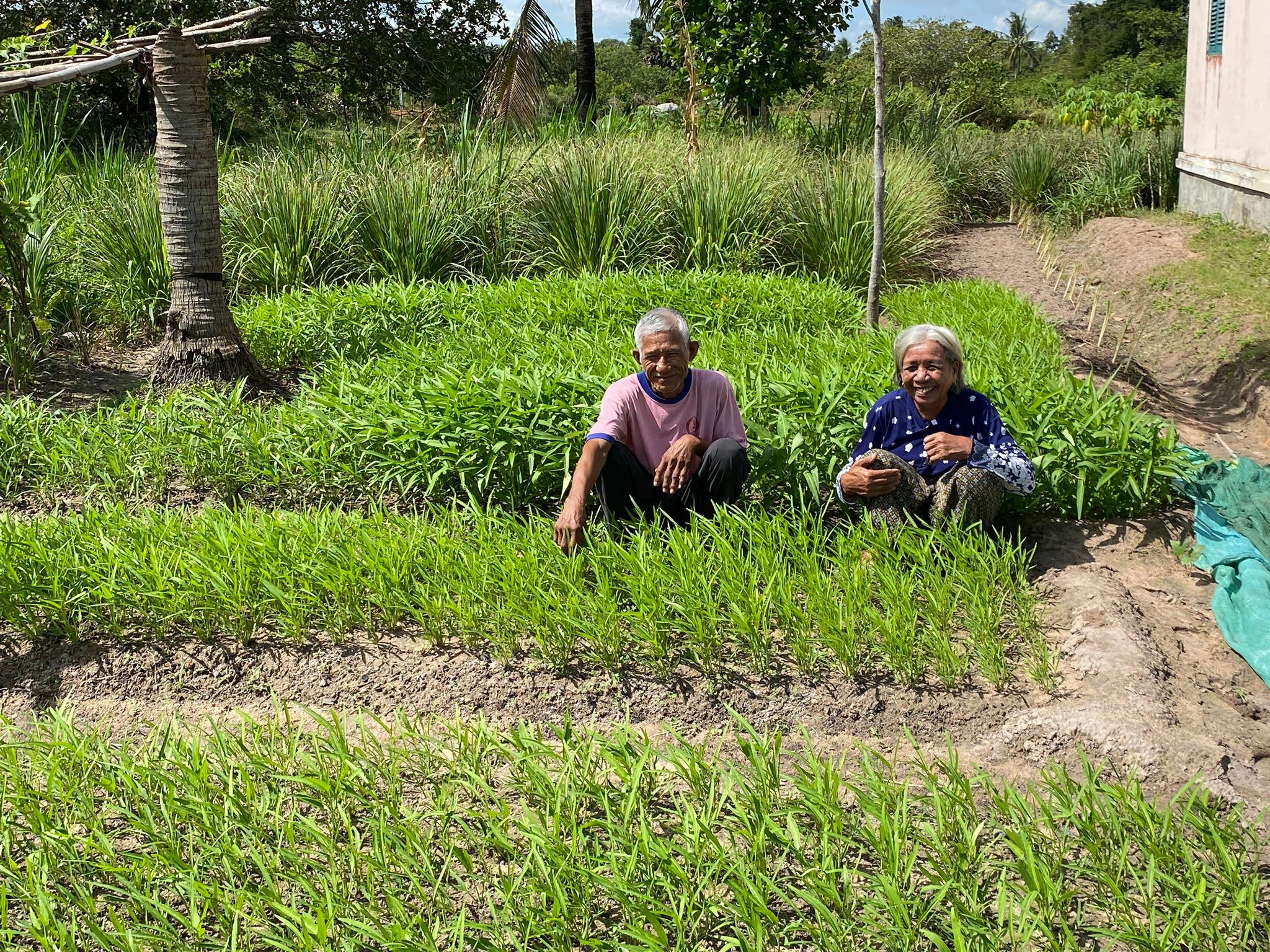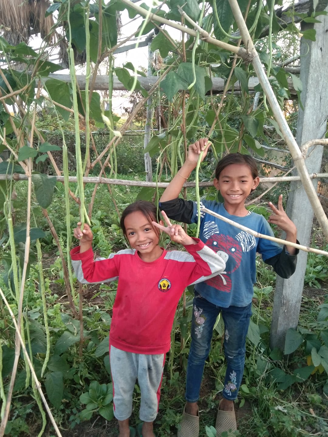 Decades a widow and now struggling with diminished vision in both eyes, Kim Pich shoulders the responsibility of caring for her mentally disabled adult daughter and two grandchildren, whose parents live and work far away. For Kim Pich, the garden symbolizes hope—a means to ensure her grandchildren can continue their education. Recently, her modest garden has increasingly succumbed to flooding during the rainy season. This year, F2F introduced Kim Pich and her granddaughters to innovative gardening techniques using sacks and foam containers, offering protection for their vegetables against the extremes of both floods and drought. Inspired by their success, the young girls are eager to expand their gardening efforts.
