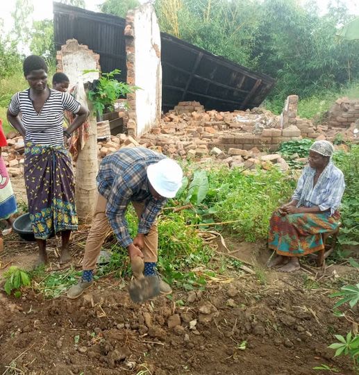 F2F staff and Victory Garden Facilitators hard at work, helping to rebuild a garden for a local villager whose house was destroyed by Cyclone Freddy (with the remains of the house visible in the background). This woman lost both her maize crop and her home, making even a small, food-producing garden a significant source of hope and recovery.