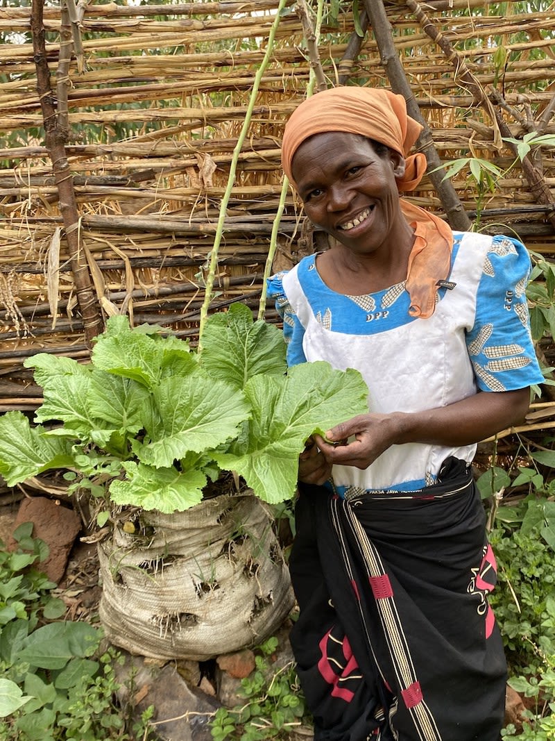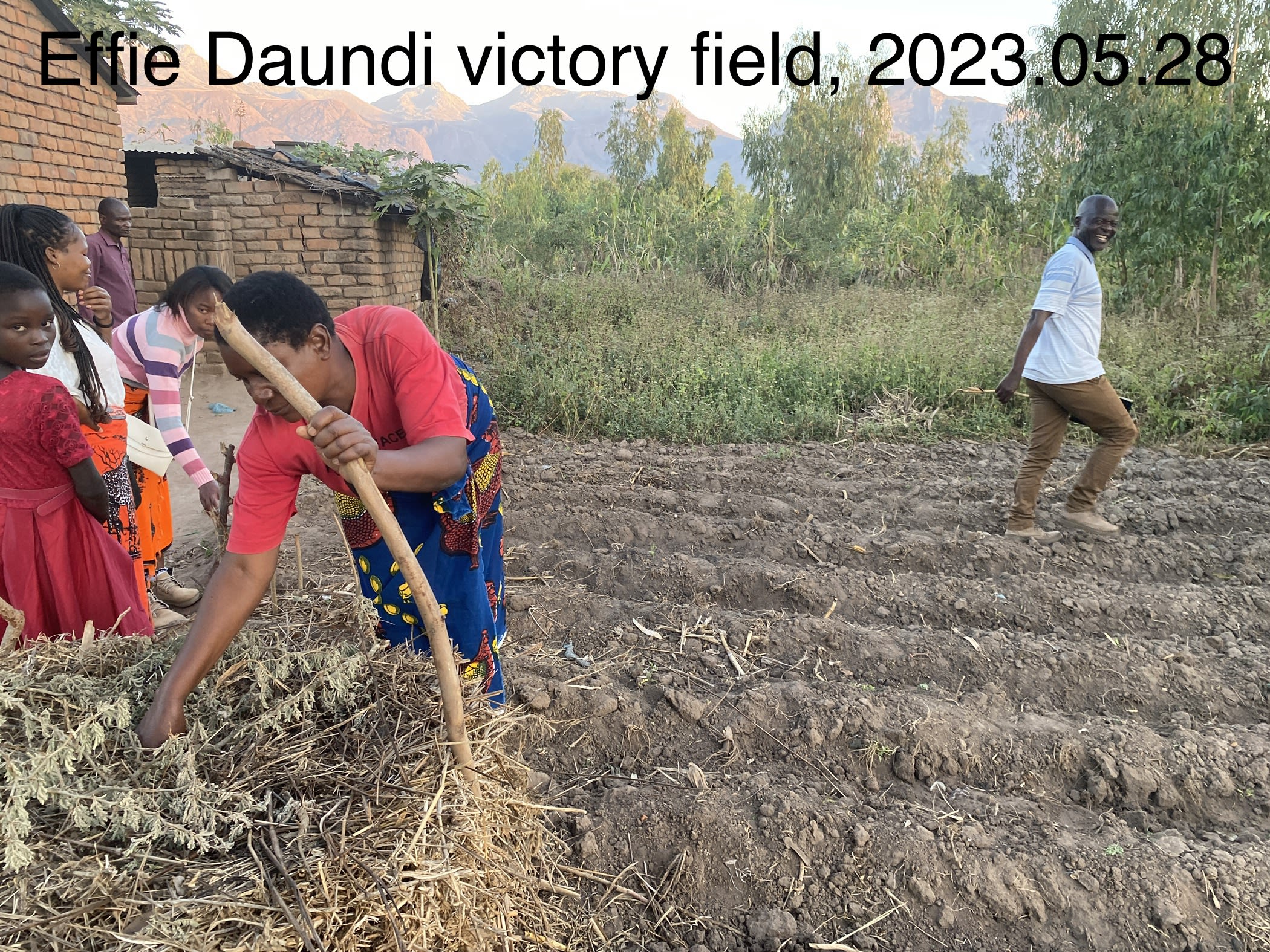 Above: Effie Daundi working in her newly planted victory field, a testament to sustainable agriculture.